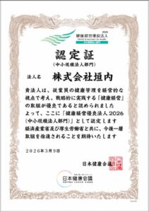 認定は、経済産業省と厚生労働省が関与する「日本健康会議」によって行われ、当社は9年連続となります。引き続き、従業員の健康管理は勿論のこと、経営面全てに「健康」の視点を当て、業務に取り組んで参ります。